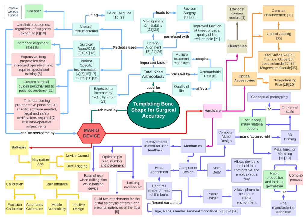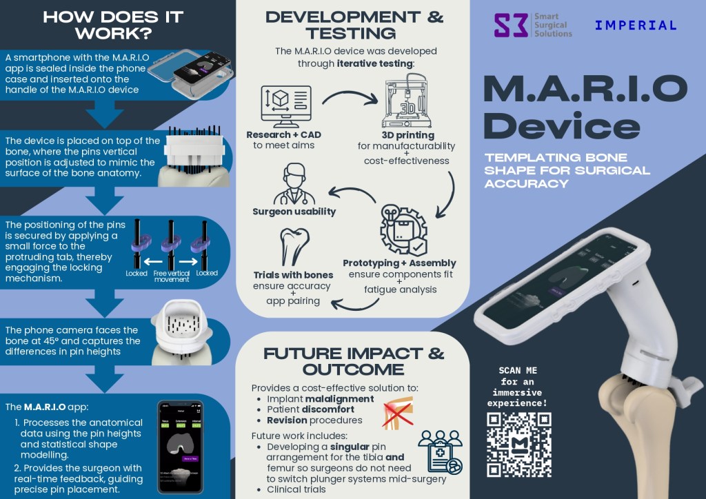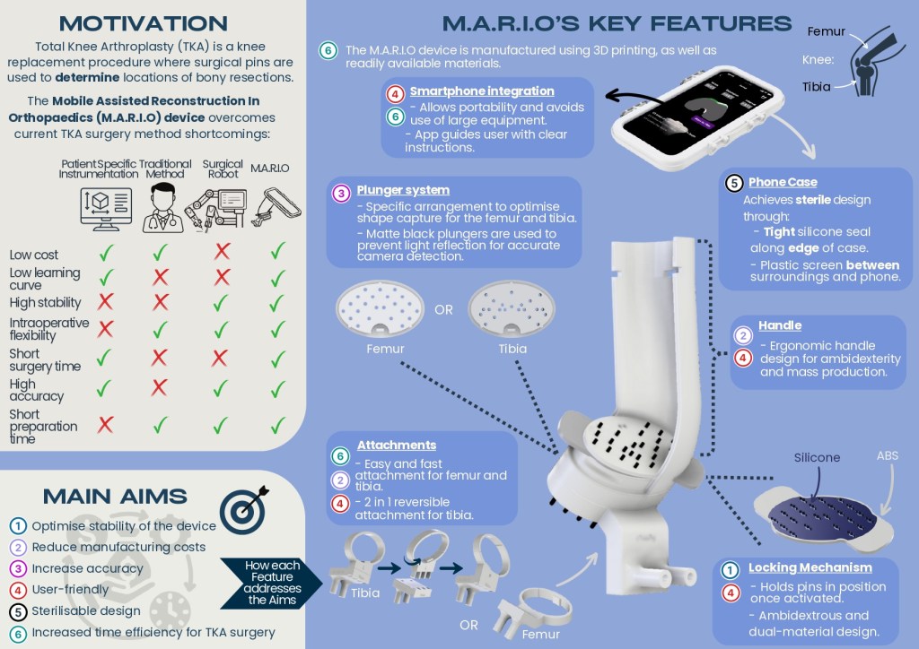 The Mobile Assisted Reconstruction In Orthopaedics (M.A.R.I.O) device was designed to improve surgical precision by offering real-time feedback during Total Knee Arthroplasty. It is a hand-held device paired with a user-friendly phone application that guides surgeons when determining pin placement.